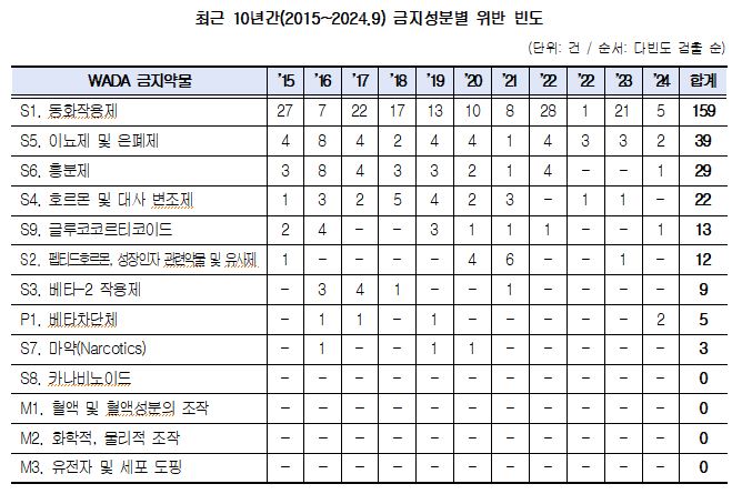 가장 많이 검출된 약물은 동화작용제(S1) 159건, 이뇨제 및 은폐제(S5) 39건, 흥분제(S6) 29건, 호르몬 및 대사 변조제(S4) 22건, 글루코코르티코이드(S9) 13건 순이다. 전체 절반 이상(54.6%)을 차지한 S1은 대표적인 금지약물로 분류된 동화작용남성호르몬 스테로이드다.