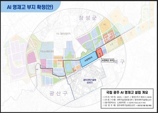 광주광역시(시장 강기정)는 광주과학기술원(GIST)과 인접한 북구 첨단3지구 인공지능(AI)집적단지 바로 옆 부지(오룡동 468일원)에 건축연면적 2만40㎡, 지하 1층~지상 5층의 학습연구동과 기숙사동 2개동 규모의 광주AI영재고등학교를 건립, 2027년 개교할 계획이다.