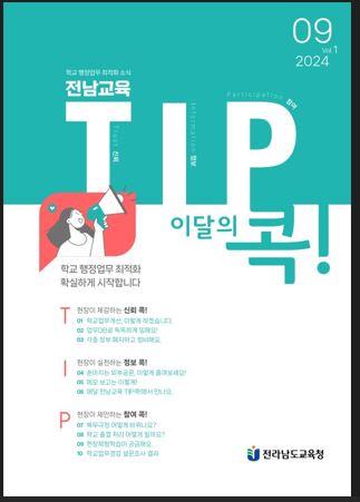 먼저 ‘전남교육 TIP(팁)콕’은 학교 현장에서 필요로 하는 학교업무 최적화 내용을 담아 매월 현장에 안내하는 웹 소식지다. 소식지는 T(Trust, 신뢰), I(Information, 정보), P(Participation, 참여) 세 가지로 구성된다.