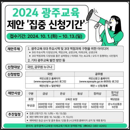 시교육청은 1일부터 13일까지 국민과 공무원을 대상으로 ‘2024년 하반기 광주교육 제안 집중 신청 기간’을 운영한다.