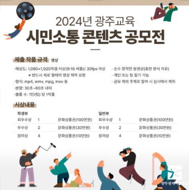 이번 공모전은 일반부와 학생부 등 2개로 나눠 진행되며, 학생부의 경우 광주에 거주 중인 학교 밖 청소년도 참가할 수 있다. 제출 작품은 해상도 1,080×1,920픽셀/30fps 이상의 순수 창작 동영상이어야 하며, 개인 또는 팀으로 참가할 수 있다.