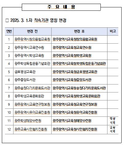 이를 위해 시교육청은 광주시의회 제329회 제2차정례회에서 기존 ’광주광역시‘ 또는 ’광주‘ 등으로 시작하는 직속기관의 명칭에 ’광주광역시교육청‘을 일괄 명시하는 내용을 담은 ‘광주광역시교육청 행정기구 설치 조례 일부개정조례안’을 제출했다.