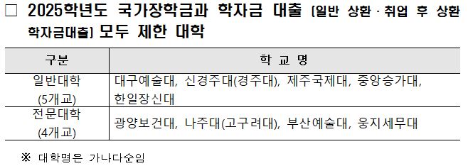 학자금지원제도심의위원회(위원장 교육부 차관)는 이러한 평가인증과 재정진단 결과를 바탕으로 심의한 결과 총 313개교 중 학자금 지원 가능 대학 303개교, 학자금 지원 제한 대학은 10개교(일반상환학자금 대출만 지원 가능한 1개 대학 포함)로 최종 결정하였다. 본 조치는 2025학년도 1년간 적용된다.