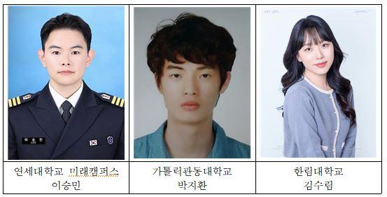 강원특별자치도(도지사 김진태, 이하 ‘도’)에서는 연세대학교 미래캠퍼스에서 경영학을 전공 중인 이승민 학생과 가톨릭관동대학교에서 콘텐츠 제작을 전공 중인 박지환 학생, 한림대학교에서 사회복지학을 전공 중인 김수림 학생이 ‘대학생청년일반부문’에서 인재상(교육부 장관상)을 수상하였다.