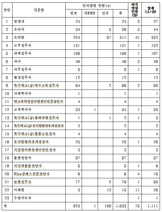 시교육청은 인사만족도를 높이기 위해 노사 간 협의를 거쳐 전보관리기준 개정안을 마련했으며, 학교(기관) 및 직종별 정수, 결원 현황 등을 사전에 안내했다. 또 희망 및 생활근거지 등을 고려해 적재적소에 배치하는데 중점을 뒀다.