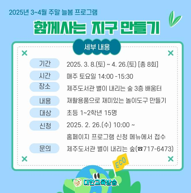 초등학생 1~2학년 15명을 대상으로 매주 토요일 오후 2시 별이 내리는 숲 3층 책 놀이터에서 운영되며 오는 26일 10시부터 제주특별자치도교육청 공공도서관 누리집(https://org.jje.go.kr/lib/index.jje)에서 선착순으로 참가 신청을 받는다.