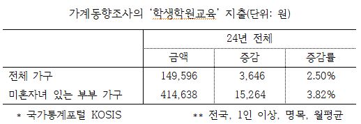 통계청이 최근 발표한 ‘2024년 4분기 및 연간 가계동향조사 결과’와 국가통계포털 KOSIS를 종합하면 지난해 학생학원교육 지출은 전체 가구 2.50%, 미혼자녀 있는 부부 가구 3.82% 늘었다. 미혼자녀 있는 부부 가구의 경우 월 41만 4천 638원으로 작년보다 1만 5천 264원 많이 지출했다