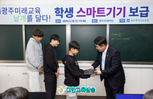 시교육청은 18일 광주서석중학교에서 이정선 교육감, 서석중 정동진 교장, 학생 25명 등이 참석한 가운데 ‘교육용 스마트기기 전달식’을 개최했다.