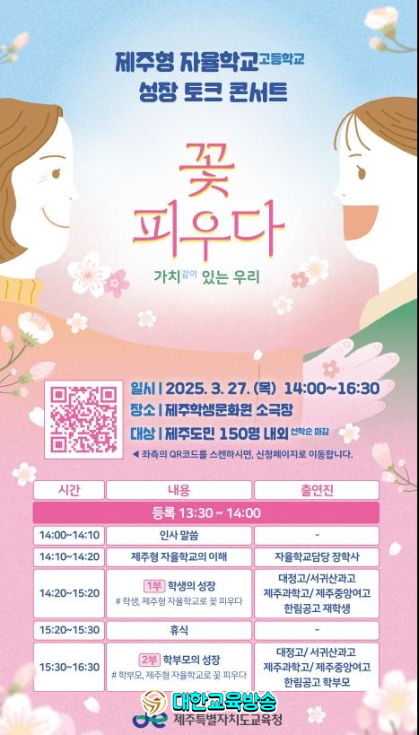 ‘학생, 제주형 자율학교로 꽃 피우다’주제의 1부 행사는 제주형 자율학교(고등학교) 재학생들의 특별한 학교 생활 경험을 공유하고 사전 질문에 답변하는 토크 콘서트로 운영된다.