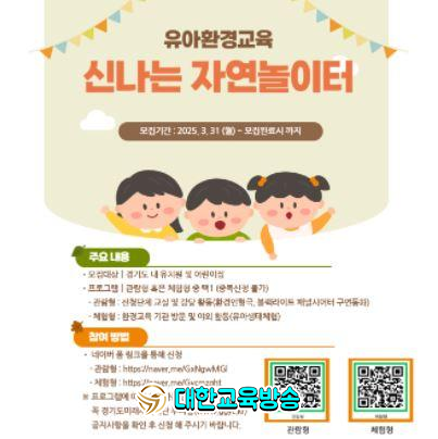신청을 원하는 단체는 ▲환경인형극(50~150명) ▲환경구연동화(50~100명) ▲유아생태체험(30~60명) 가운데 1개 프로그램을 선택하고, 경기도미래세대재단 누리집(ggyc.kr)에 접속해 신청서를 제출하면 된다. 교육 참가 비용은 전액 무료이다.