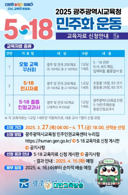시교육청은 광주를 포함해 전국 학교를 대상으로 희망 신청을 받아 오월 교육 꾸러미 200개교, 5·18 전시자료 200개교, 5·18중등인정교과서 50개교 등에 선착순 배부한다. 자료는 중복 신청할 수 있다.