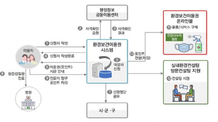 ‘환경보건이용권’은 물품 및 서비스를 구매할 수 있는 10만원 상당의 ‘상품·서비스·진료비 이용권’과 실내환경 방문 컨설팅 및 필요 시 장판·벽지 교체를 지원하는 ‘실내환경 컨설팅 이용권’으로 나뉜다.