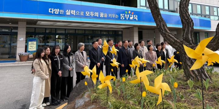 이명숙 교육장을 비롯한 전 직원들은 청사 화단에 노란 바람개비와 노란 리본을 설치하며 세월호 참사 희생자들을 추념하고, 안전한 사회를 만들기 위한 다짐의 시간을 가졌다.