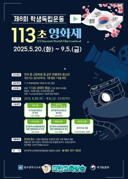 ‘학생독립운동 113초 영화제’는 학생독립운동에 관한 관심을 제고하고 청소년들의 역사의식 확대를 지원하기 위해 시교육청·광주학생독립운동기념회관 주관, 국가보훈부 후원으로 운영되고 있다.
