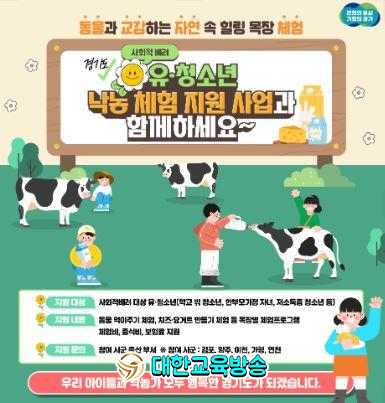 이번 사업에는 김포, 양주, 이천, 가평, 연천 등 5개 시군에서 참여하며, 총 90회 체험 기회를 제공한다. 1회 기준 10명으로 전체 900명의 학생들이 체험에 참여할 수 있다. 체험비는 물론 중식비와 보험료까지 지원되며, 참여를 희망하는 사회적배려 유·청소년 개인 또는 단체는 시군 축산부서로 문의하면 된다.