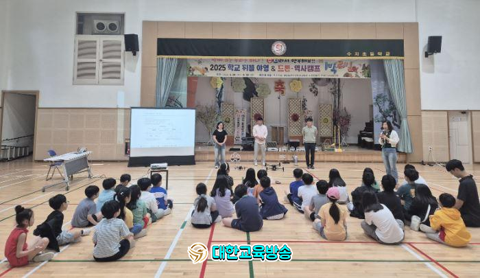 해마다 이루어지는 학교 뒤뜰 야영에 첫 오프닝은 알파드론 지원으로 우리들은 ‘하늘을 날다’ 수지 드론 특공대가 되어 드론 조작, 모둠 미션 수행, 하늘에서 바라 본 수지초와 수지 마을을 담아 보는 신기한 미래 시대 체험이었습니다.