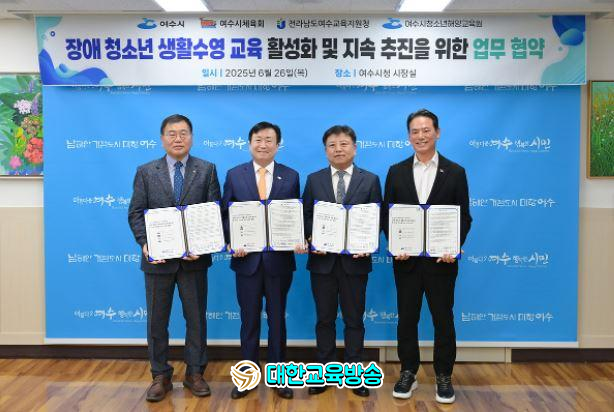 시는 지난 26일 여수시체육회, 전라남도여수교육지원청, 여수시청소년해양교육원과 장애 청소년 생활수영 교육 활성화 및 지속 추진을 위한 업무협약을 체결하고 ‘장애 포용형 생활수영 교육 모델’ 구축을 본격화했다.