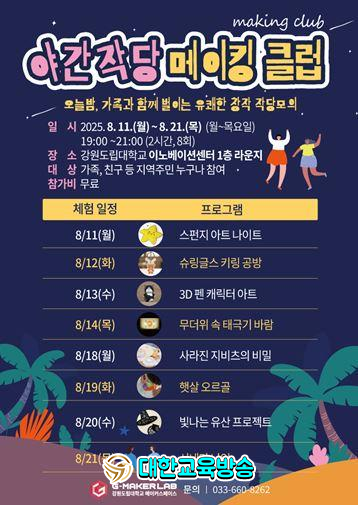 이번 ‘야간 작당 메이킹 클럽’은 창의력이 더욱 활발해지는 야간 시간대를 활용해 청소년, 지역주민, 가족 단위 참가자들이 자유롭게 창작활동에 몰입할 수 있도록 기획된 참여형 체험 프로그램이다. 사업단이 보유한 다양한 장비와 콘텐츠를 기반으로 구성된 체험 중심 프로그램으로, 창작 초보자부터 경험자까지 모두가 즐길 수 있는 여름밤의 메이킹 축제가 될 전망이다.