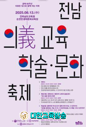 전라남도교육청(교육감 김대중)은 13~14일 순천만생태문화교육원에서 ‘광복 80주년 되찾은 빛으로 함께 여는 미래’를 주제로 전남 의(義)교육 학술·문화 축제를 개최한다. 이번 축제는 제7기 전남학생의회가 직접 기획하고, 학생·교직원·학부모·지역사회가 참여하는 배움·공론·공유의 장이다.