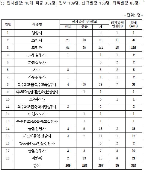 이번 인사 대상은 전보 109명, 신규 발령 158명, 퇴직 85명 등 총 352명이며, 통학차량실무사 정기인사와 교육공무직원 희망전보인사가 포함됐다.