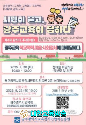 광주교육에 관심이 있는 학부모·시민은 오는 29일 오전 10시까지 온라인(https://naver.me/xqubSZJe)으로 신청하면 된다. 단, 사전 질의 접수는 오는 22일까지다.