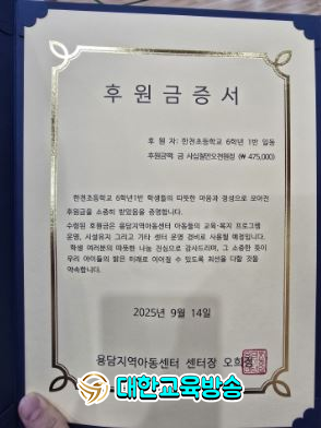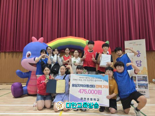 [대한교육방송] 한천초등학교(교장 김진미)는 지난 14일 제주형 자율학교 공동교육과정‘어쩌다 초등 사장 활동’플리마켓 수익금 47만5000원을 용담지역아동센터에 기부했다.