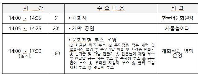 사물놀이패의 개막 공연을 시작으로, 훈민정음 탁본, 전통놀이, 솜사탕 만들기, 문자도 그리기, 멋글씨(캘리그래피) 등 다채로운 문화 체험이 마련된다.