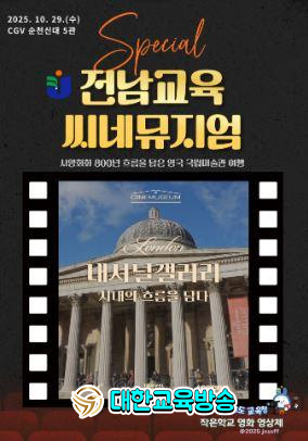 이 프로그램은 CJ CGV ICECON의 ‘씨네뮤지엄’을 전남교육청 맞춤형 인문학 교육 콘텐츠로 재구성한 것으로, ‘내셔널 갤러리, 시대의 흐름을 담다’라는 주제 아래 유럽 미술의 역사와 예술가들의 삶, 문화적 배경을 인문학적 시각으로 조명한다.
