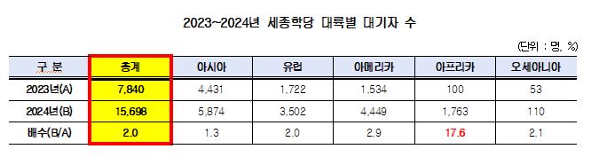 국회 문화체육관광위원회 소속 민형배 의원(더불어민주당, 광주 광산을)이 세종학당재단으로부터 제출받은 자료에 따르면, 지난해 세종학당 대기자 수는 전년 대비 약 2배 증가했다.
