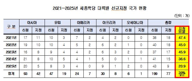 반면, 세종학당 신규 지정은 대기자 증가세를 따라가지 못하고 감소 추세다. 2021년에는 38개국이 신규 지정을 신청해 18개국이 최종 선정돼 지정 비율이 47.4%에 달했다. 그러나 2025년에는 43개국 중 9개국만 지정돼 비율이 20.9%로 급감했다.
