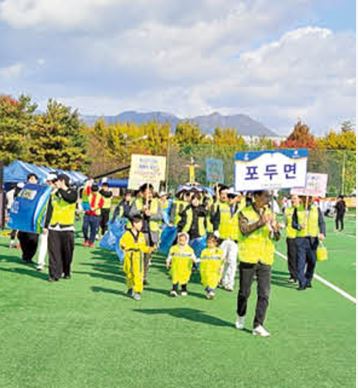 포두면 향우회는 맨 선두에 유치원생 화동 두 명을 선두로 전국 어린이 줄넘기 대회에서 우수한 성적을 거둔 일곱살 양정안군이 줄넘기 시범을 보이면서 줄넘기 묘기를 선사하며 입장식을 리더했고 「환경도 지키고 지구도 살리고 재광포두면향우회는 ESG 실천과 저 출생 극복에 앞장섭니다」라는 현수막과 “지구도 웃GO- 향우도 웃GO- ESG로 함께하GO !” “탄소는 빼고 ! 정은 더하고 ! ESG 향우회 출동 !” “플라스틱은 줄이고- 향우 사랑은 늘리고 !” “깨끗한 고흥 ! 행복한 향우!”의 폼 포드 피켓을 흔들며 입장하였다. 포두면 향우들은 입장하면서 쓰레기를 줍는 「ESG 줍킹」을 실천하였고 쓰레기통, 집게, 봉투를 준비하여 직접 운동장의 쓰레기를 주우면서 입장하여 획기적인 아이디어에 참석자 모두가 역시 포두면은 다르다는 감탄과 박수를 보냈다.
