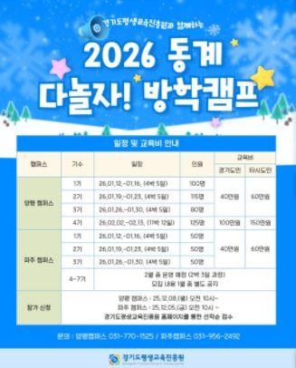 참가비는 4박 5일 과정 경기도민 40만 원, 타 시도민 60만 원이다. 11박 12일 과정은 경기도민 100만 원, 타 시도민 150만 원이다. 파주 4~7기는 2박 3일 일정으로 2월 중 운영되며, 참가비와 세부 내용은 1월 중 별도로 안내될 예정이다.